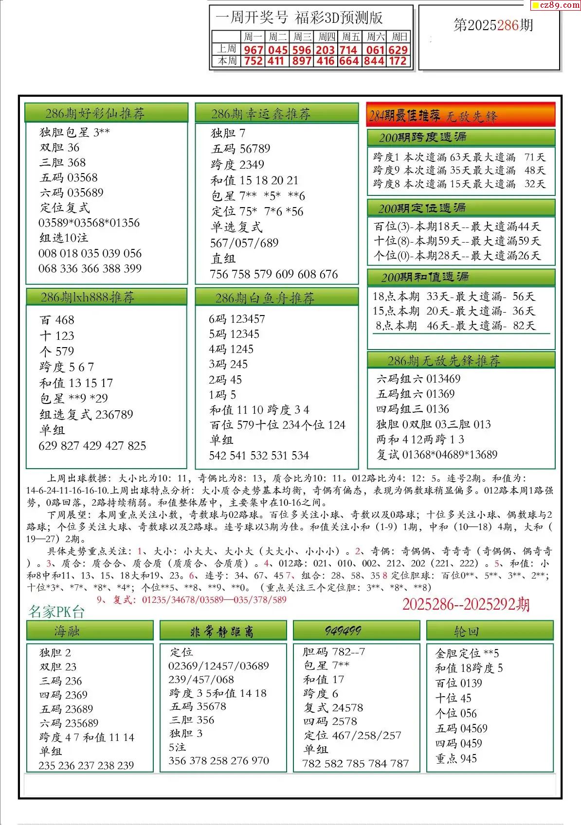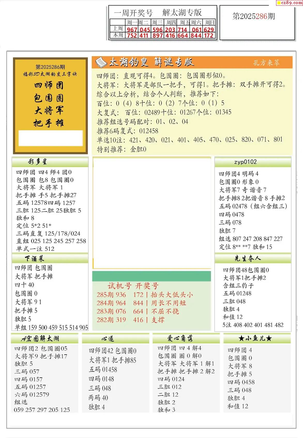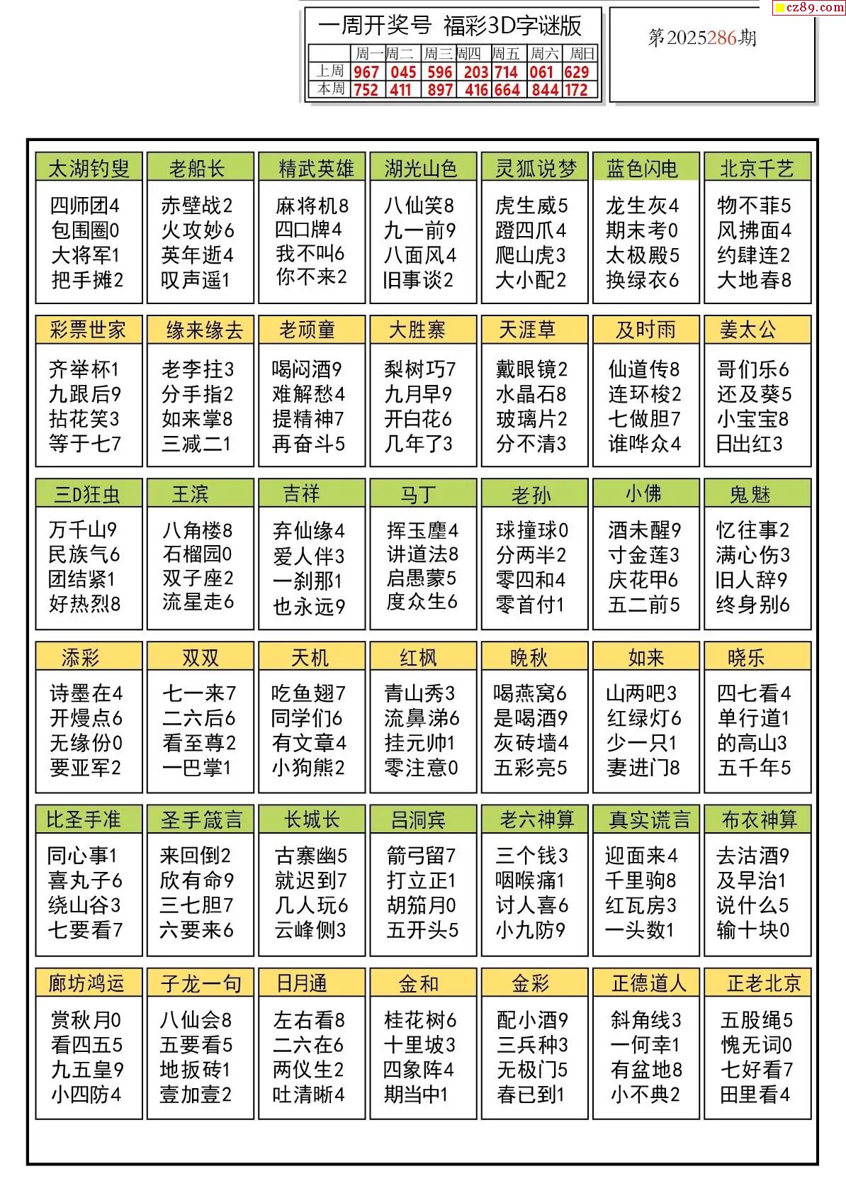 福彩3D2025286期彩赌侠一句定三码字图谜